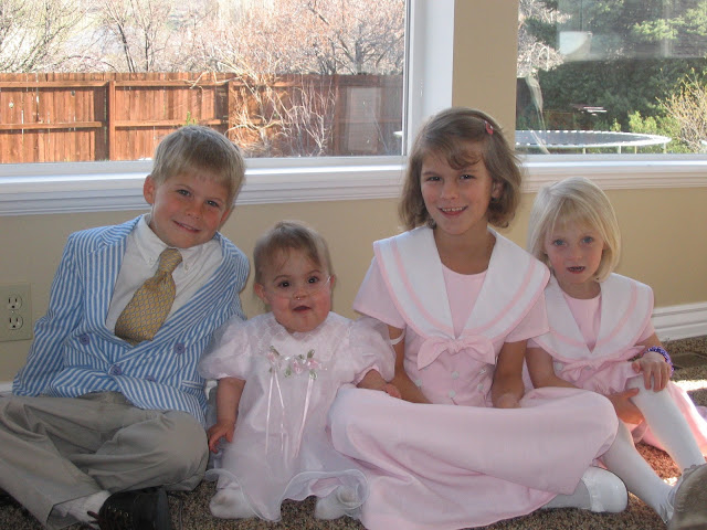 Unsere Osterhase aus Neufahrn hat uns eine Pakette geschenken. [Frau Czadek used to send us chocolate at Easter every year.] Actually there is something grammatically wrong with that sentence. This morning we read about Jesus' last week from the book of Matthew. Paula bought a ping-pong table and it has been wildly popular. Scott worked on sprinklers and dug outside for 5 hours yesterday. For the last 3 hours it was raining. Garrett and Lincoln played in the Canyon View Jr. High band concert. Mindy went shopping with Paula. On their way out of the store, Mindy saw a woman wearing a sleeveless and strapless shirt and exclaimed, "Why is she naked?' Susanna's soccer team continues its winning ways and Susanna continues to enjoy playing. Paula took Jan, Garrett, and Lincoln clothes shopping at Kohl's and spent $250 for them and the rest of the family (except, sadly, not (much) for Paula). Jan is looking into buying a new trumpet. Talmage is trying half-heartedly to stop sucking his thumb. Paula puts 10 M&M's in a cup in the morning and every time he gets caught sucking his thumb he forfeits one M&M to the person who caught him, usually Lincoln. Camille has figured out how to go from sitting to crawling on her own.