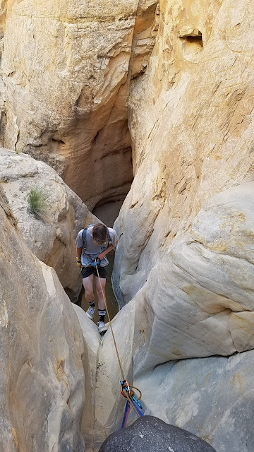 The second rappel is just a steps away down canyon. It's another 130-footer. Here is Talmage again, going down the 2nd rappel.