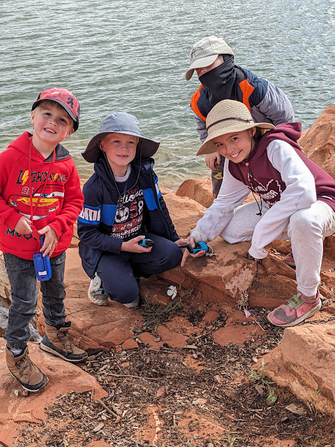 That first evening I was feeling pretty grumpy about the weather but my sweet husband set me up with a propane heater, a campfire, and a blanket and we all had fun cooking s'mores--the main reason my youngest daughter goes camping--and I'm not kidding. I got a lot of selfies with my grandchildren. Max was willing to sit on my lap and help me stay warmer.